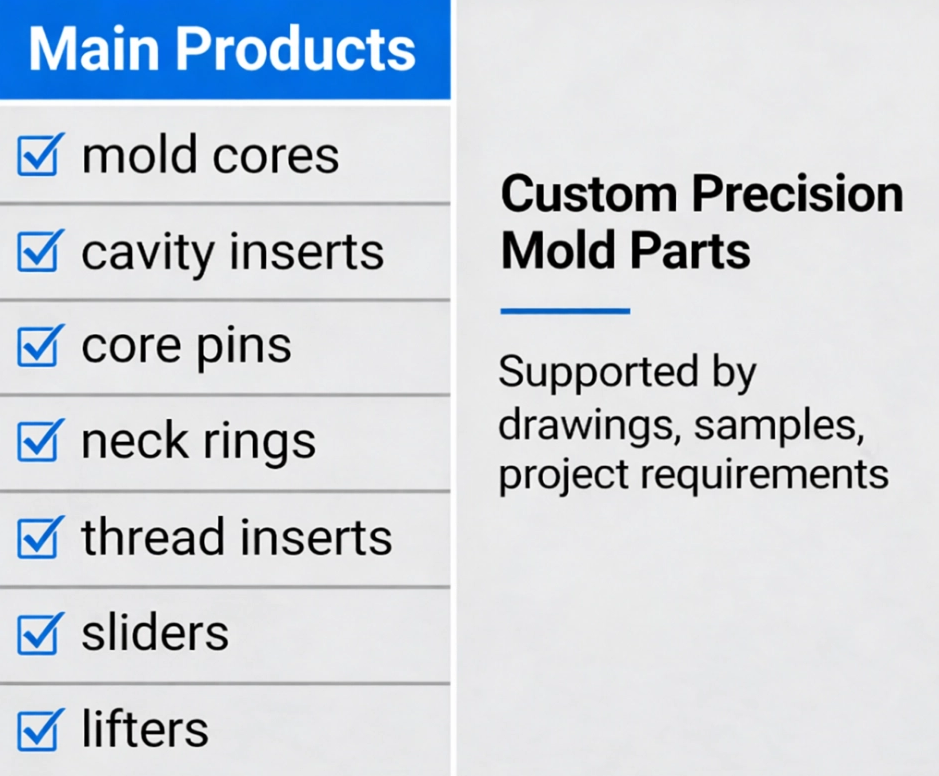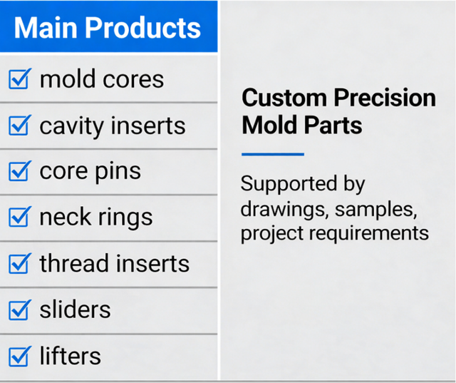 Our main products include mold cores, cavity inserts, core pins, neck rings, thread inserts, sliders, and lifters. We also support custom precision mold parts based on drawings, samples, and project requirements.