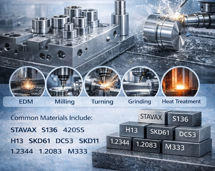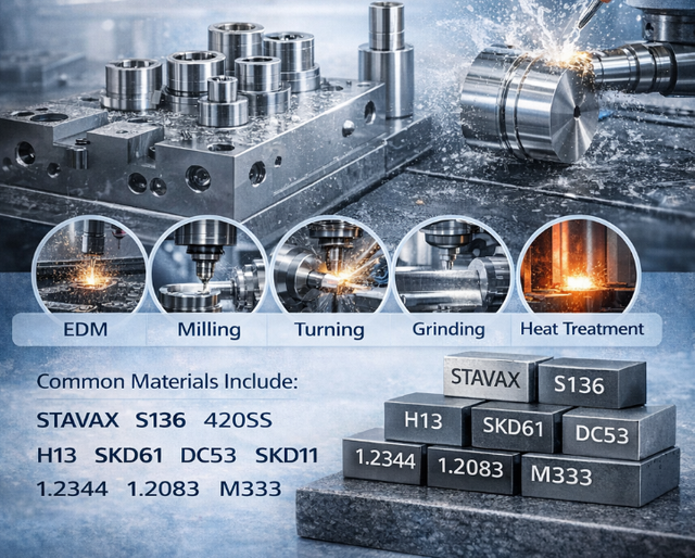 We use EDM, milling, turning, grinding, polishing, and heat treatment based on part requirements. Common materials include STAVAX, S136, 420SS, H13, SKD61, DC53, SKD11, 1.2344, 1.2083, and M333.