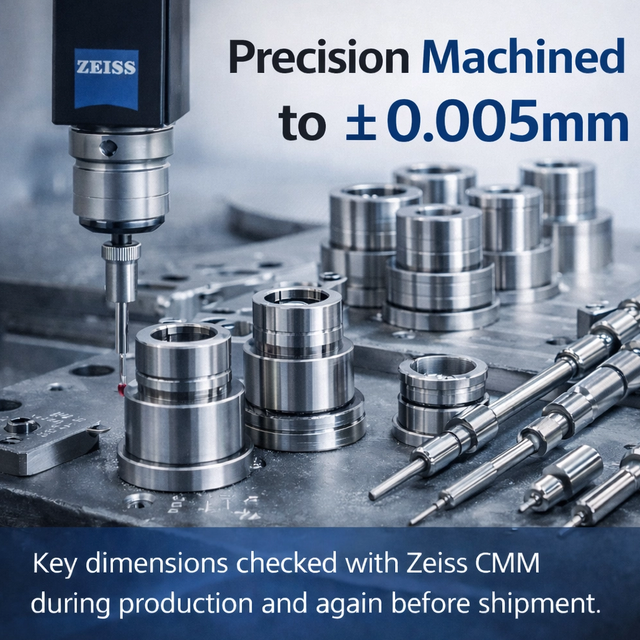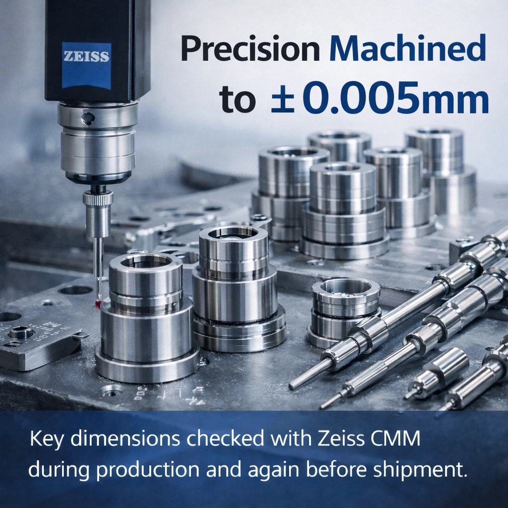 Typical tolerance capability can reach up to ±0.005 mm for critical features, depending on geometry, material, and process. Key dimensions are checked with Zeiss CMM during production and again before shipment.