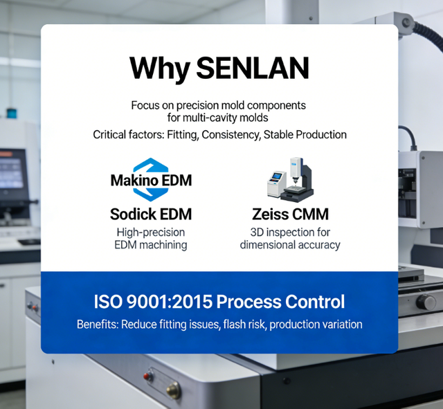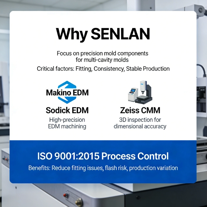SENLAN makes precision mold components for multi-cavity molds. With Makino and Sodick EDM, Zeiss CMM inspection, and ISO 9001:2015 process control, we help improve fitting and production stability.